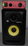 This absolutely awesome speaker set consists of a pair of the iconic KRK Rokit 5 Classic near field speakers, a SUB-1 preamp, a 1/4 kW subwoofer amp, a subwoofer and all associated cables. It is intended for use in a studio setting near a mixing console or a gaming rig with a multi-display setup. The Rokits are near mint and have seen only little use. The SUB-1 preamp is a development sample of a commercial device which unfortunately never made it to production. Its functions are VOLUME, SUB TRIM which is used to tune the sub level from the preamp, a SP/HP switch to select speakers or headphones, a FLAT/SUB switch which switches in a filter to relieve the Rokits of producing the lowest audio frequencies and using the subwoofer for that task. The reasoning is that in order to produce a high SPL the Rokits run out of oomph and need additional power from the subwoofer as the lowest frequencies carry the most energy. A lockable Neutrik headphone jack, a headroom (CLIP) indicator, a power indicator and the 3.5 mm stereo input socket complete the front panel. The rear panel has the three XLR sockets for the outputs and the Powercon receptacle for the power cord.