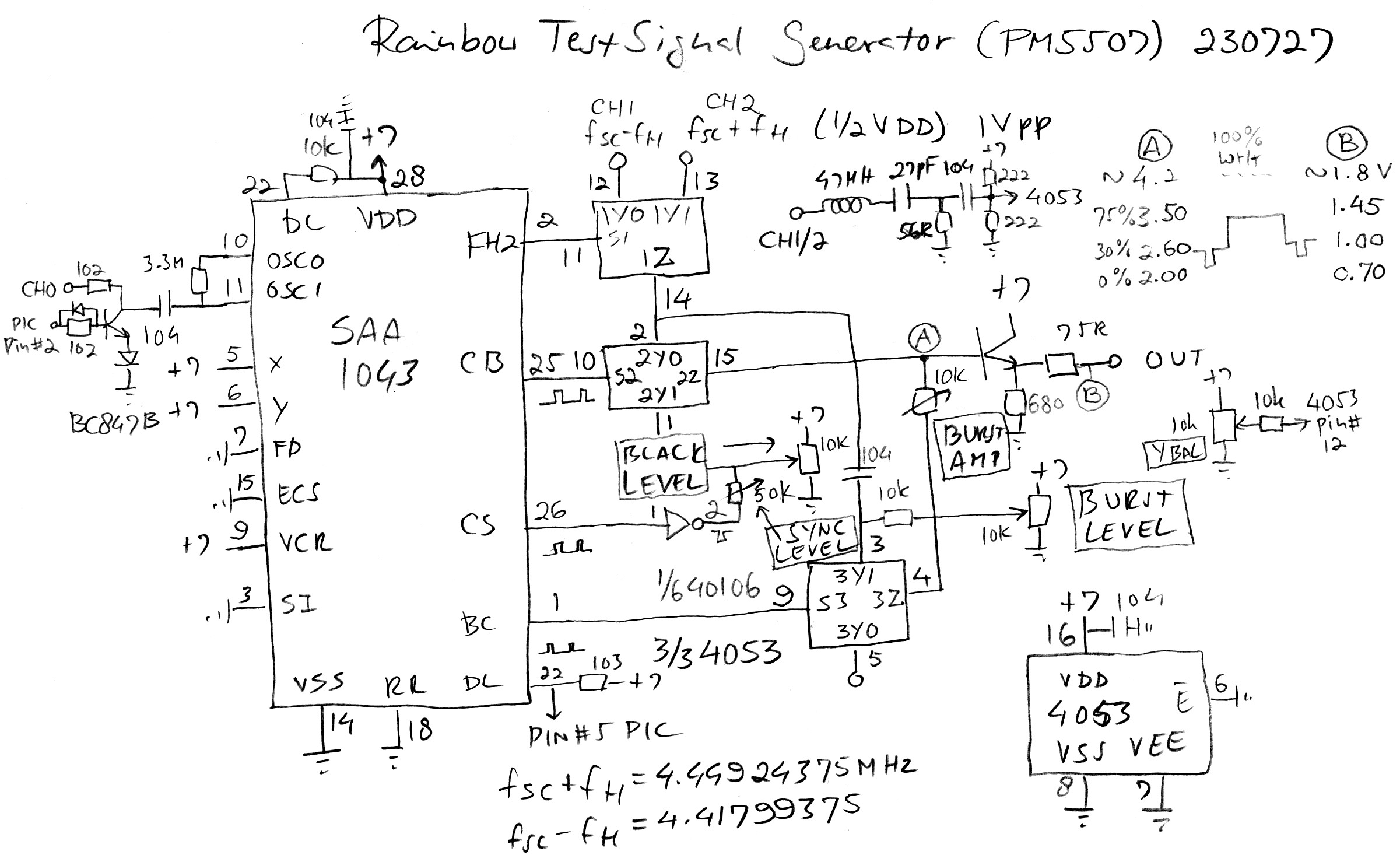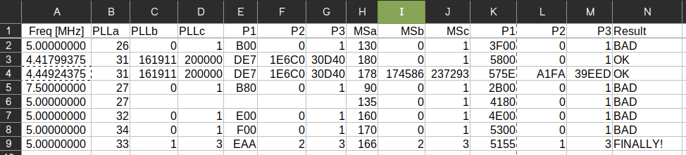 But still I wasn't done. Because the PM5507 uses the difference between the two subcarrier frequencies to generate the sync signals, I wondered if I could use an Si5351A driven by a PIC to generate the frequencies. And I could! Another spreadsheet to calculate the synthesizer parameters (forgot why I needed the BAD in the result column):