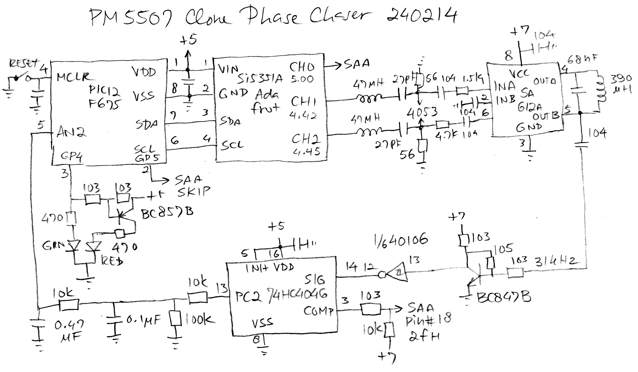 But there was a problem. Because the horizontal frequency is not locked to the subcarriers the phase is random and the color decoder of the TV cannot lock onto it. I put the project aside for a few months until I realized that the difference frequency of the subcarriers can be used to detect the phase. The SAA very nicely has a 2f(h) output that can be used to drive a phase detector. I chose a 74HC4046 because it has a phase detector that goes Hi-Z when not active. The SAA is "nudged" into the proper phase by skipping a few clock pulses: