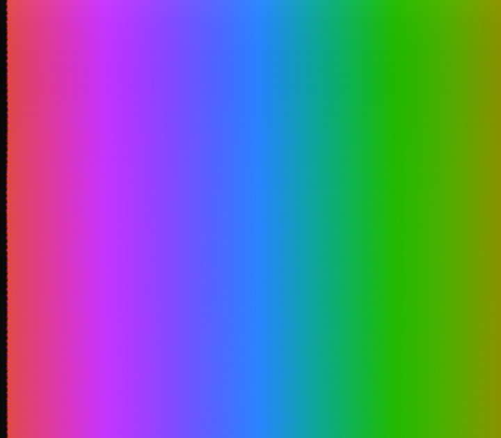Then things got out of hand. I use a Raspberry Pi to generate testpatterns (PA3BWE's pi-atv) so I wondered whether I could create the rainbow with it. I kludged together a spreadsheet to calculate the RGB values for each part of the circle traveled during a line time period (64 µs of which 52 µs is active video). With some Linux script trickery I fed it to GIMP and created the rainbow as an image: