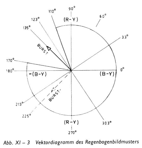 The PAL bursts show nicely albeit distorted due to the harsh switching. The fun part is that while the NTSC version needs only one unusual frequency, the Philips needs two. This is caused by the PAL switching which (as you may know) is a refinement of the NTSC system and results in the tint control being redundant. All phase errors are compensated due to the phase switching (PAL stands for Phase Alternation on Lines). Needing to special crystals with unusual frequencies of course is a cost issue. The rainbow signal was not used extensively because the real color bars showed up in test equipment real soon when electronic tech developed new circuitry. The nature of the signal prevents usable measurements as there is no reference. The RGB color bars do have a reference and are much more convenient.