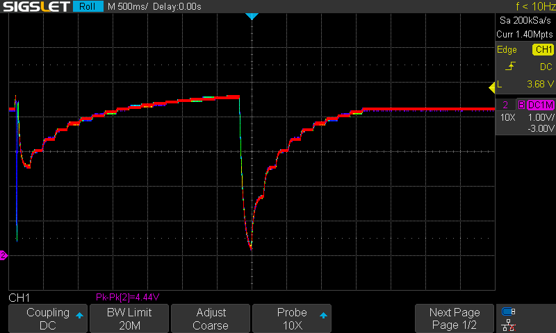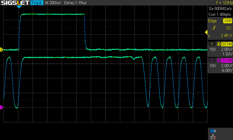 In this plot, the RESET button is pressed and the PIC nudges the SAA through a full cycle. Then the phase flip is detected and the PIC stops nudging at the right voltage level.