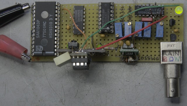 and my program (asm) was good to go. Of course I needed some hardware too. I have a couple of very vintage SAA1043 sync generator ICs in my tray and that is why I need the 5.000 MHz. The hardware was quickly built: